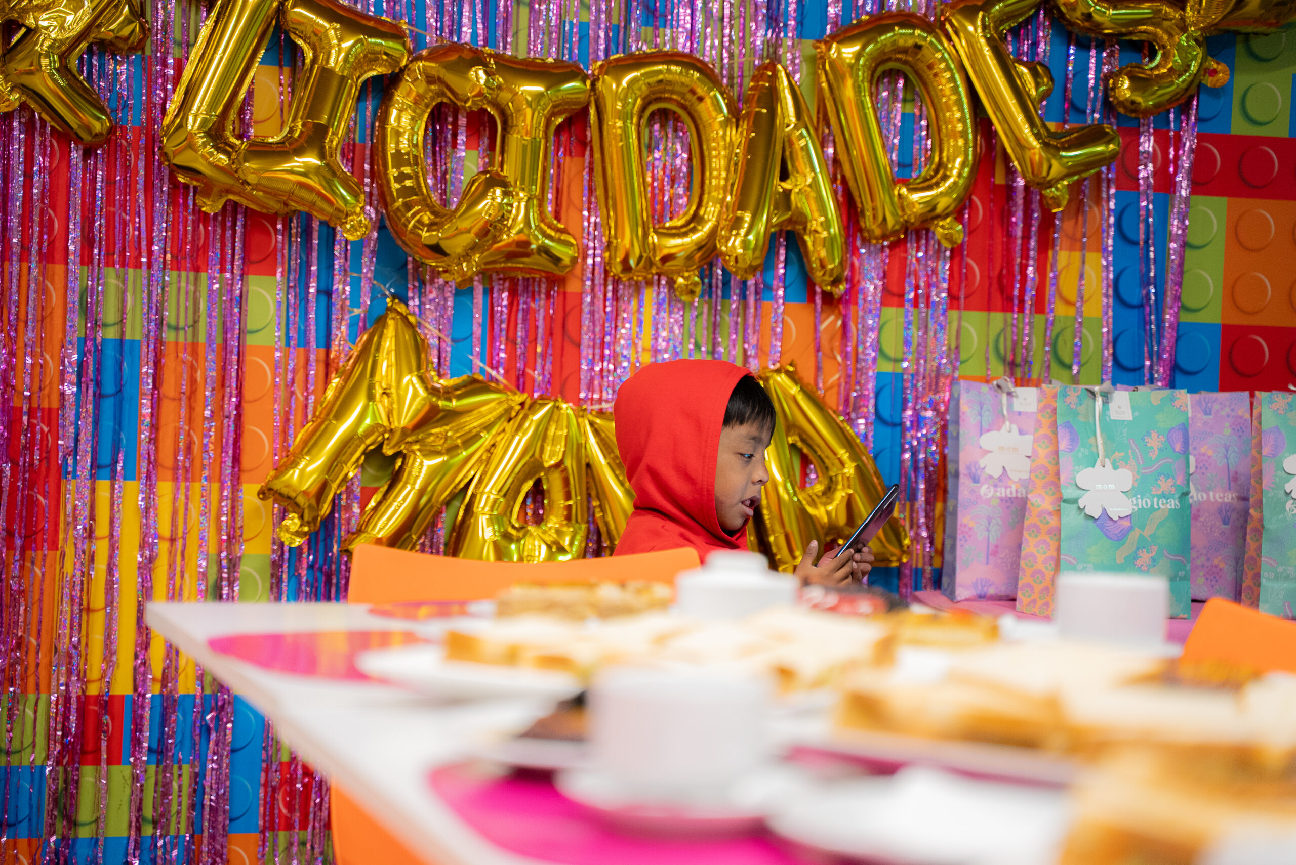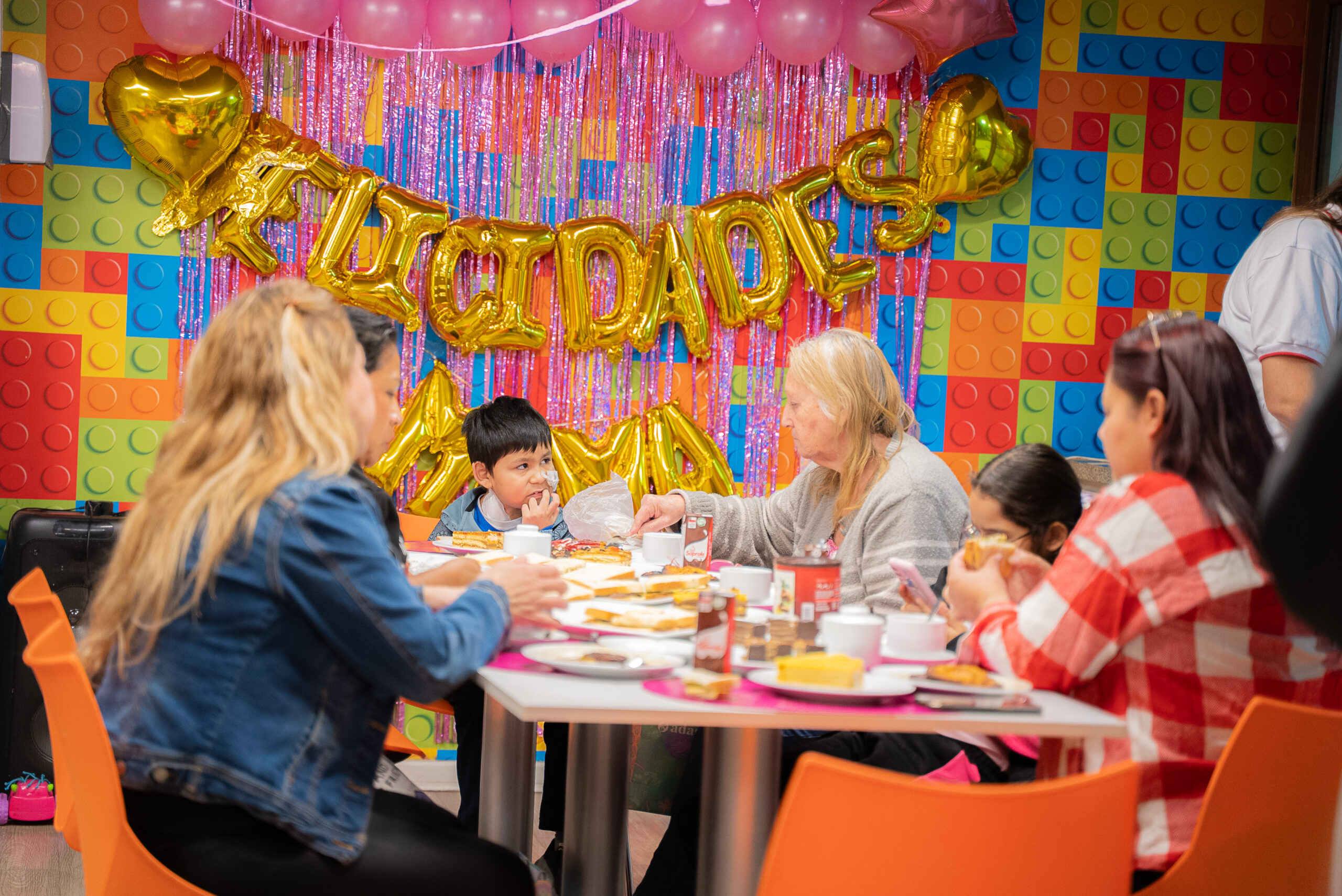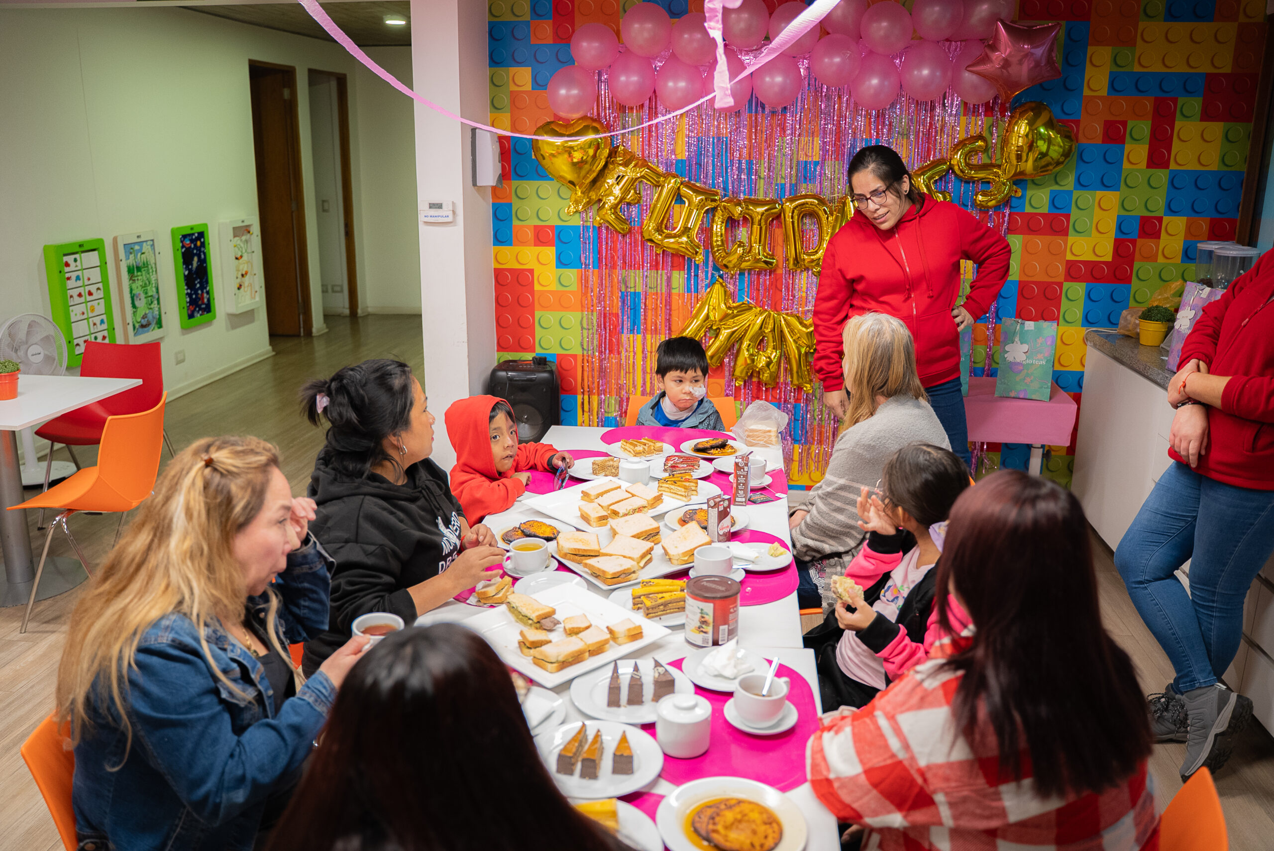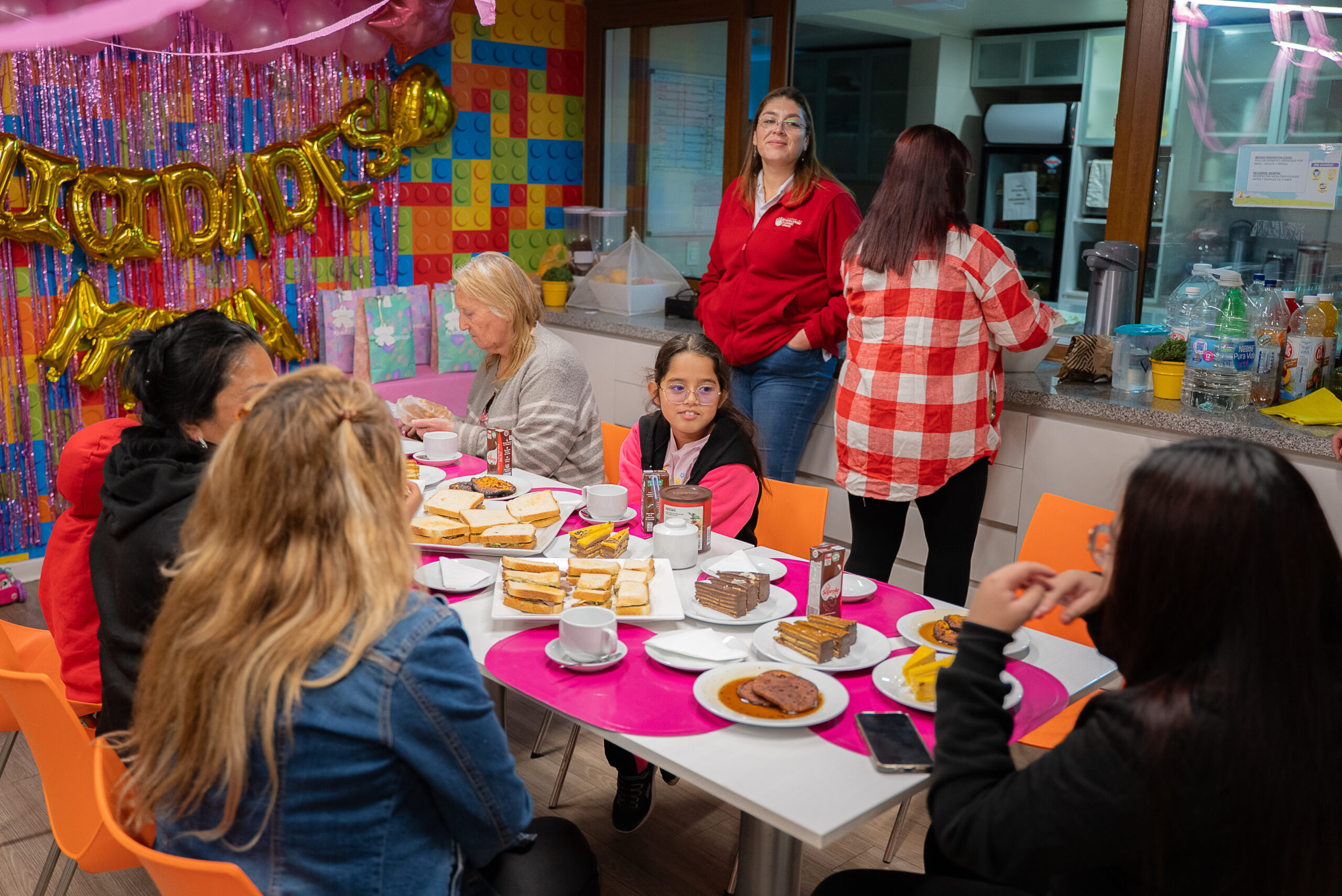 El ambiente es festivo y acogedor, con decoraciones coloridas y globos dorados que forman el mensaje «Felicidades Mamá». Las asistentes, madres de diversas edades junto a sus hijos, comparten un agradable momento alrededor de una mesa servida con tortas, sándwiches y bebidas.