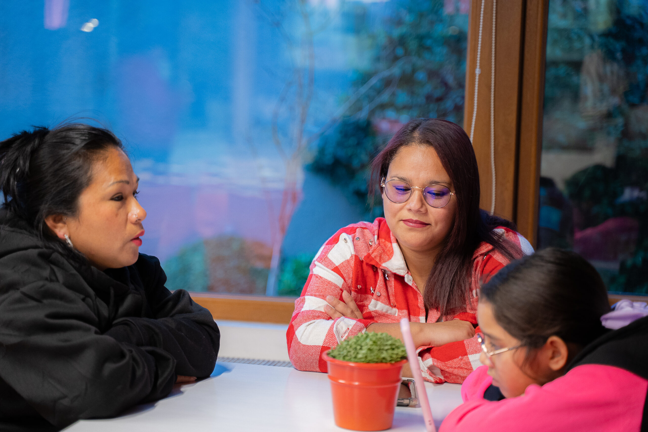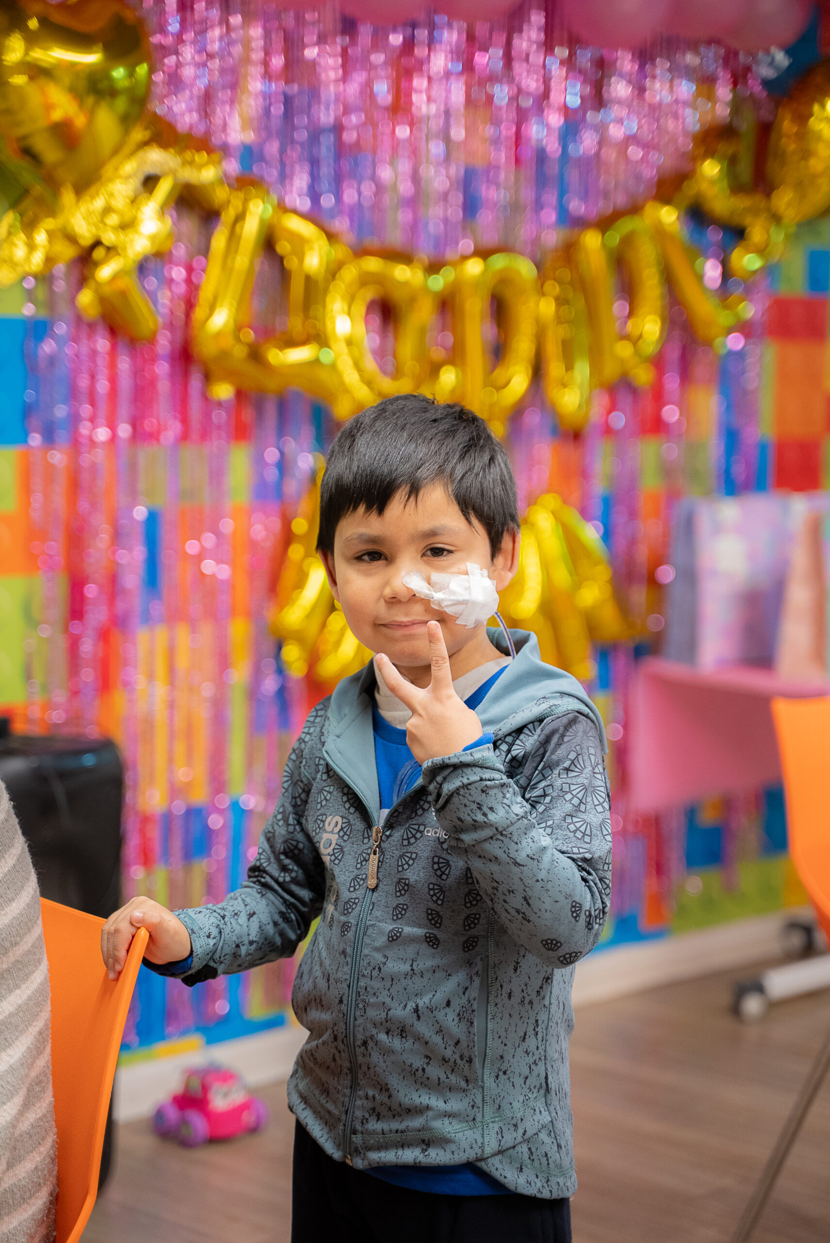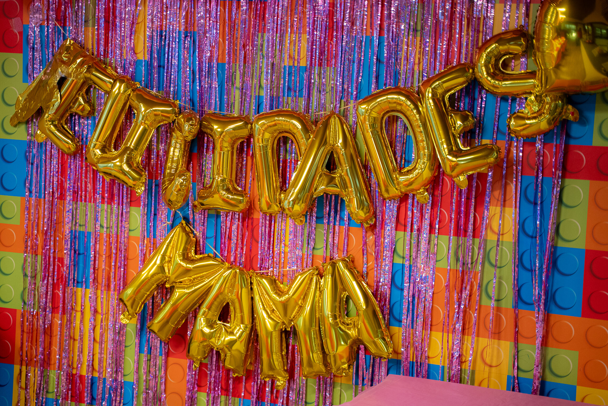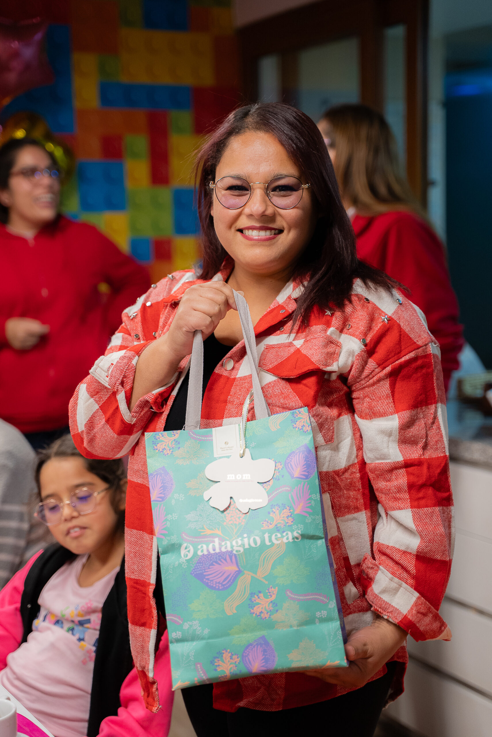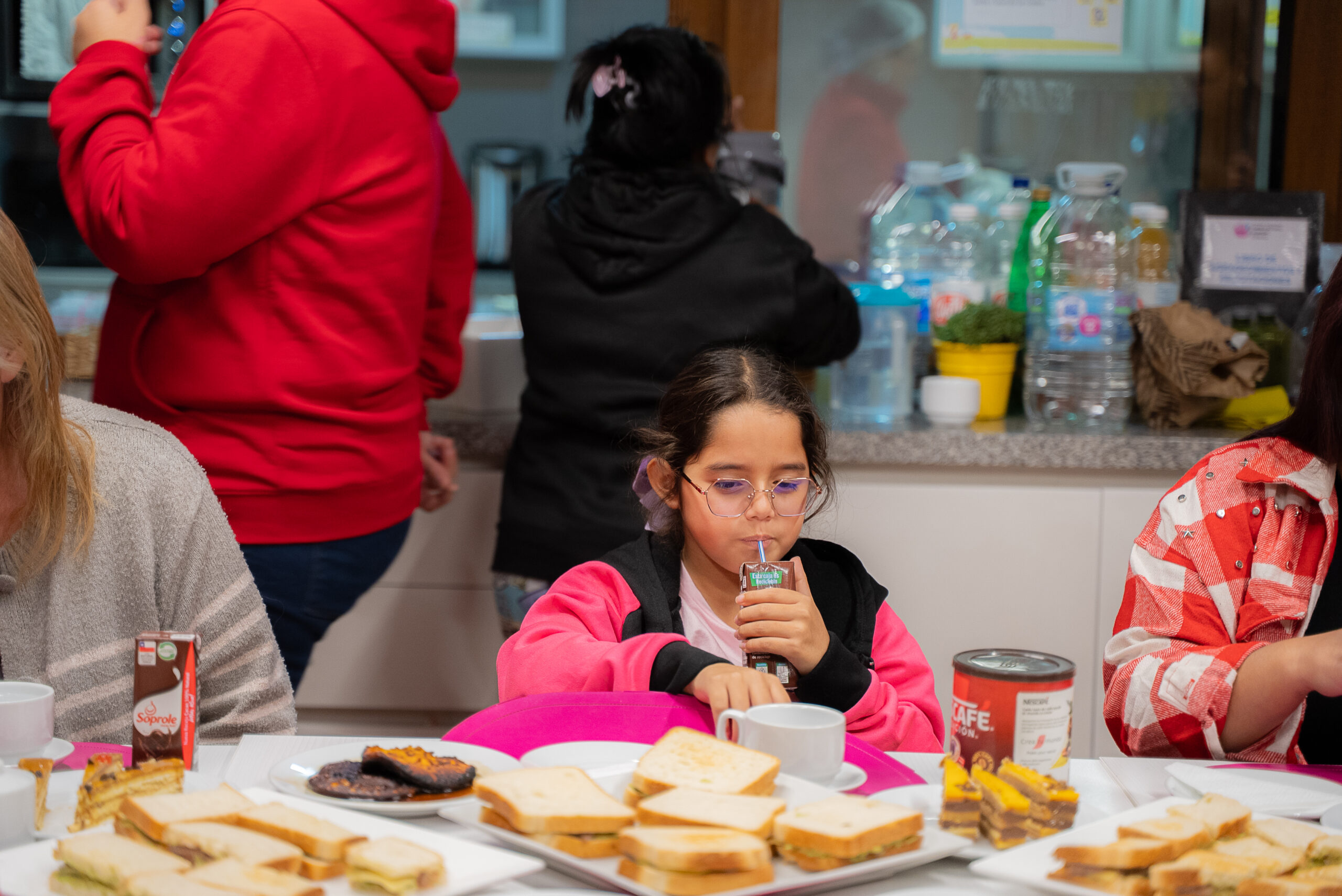 El ambiente es festivo y acogedor, con decoraciones coloridas y globos dorados que forman el mensaje «Felicidades Mamá». Las asistentes, madres de diversas edades junto a sus hijos, comparten un agradable momento alrededor de una mesa servida con tortas, sándwiches y bebidas.